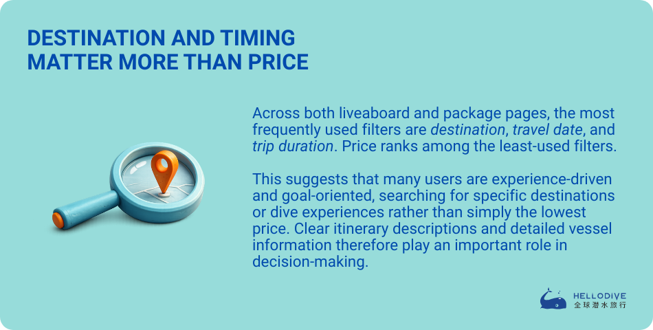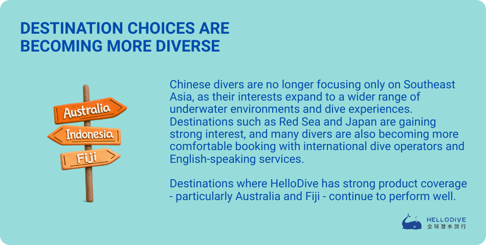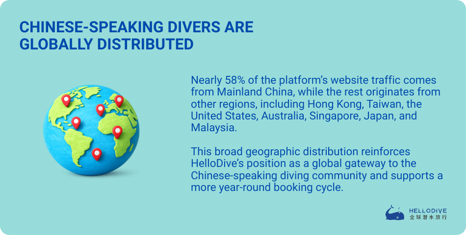 As the platform gradually establishes a steady user base, the data generated through it has begun to reveal patterns in how Chinese divers research, plan, and book their dive trips - insights that were difficult to observe when HelloDive operated purely as a media platform.